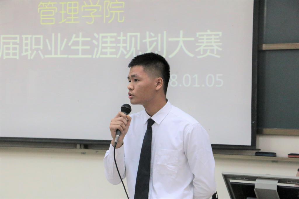 在比赛过程中,来自17级旅游管理1班的腾达基同学以其优秀的表现让评委和观众眼前一亮。腾达基同学在自己的规划书中认真分析了自己的特征、职业认知、职业能力、职业前景等,他还提到受父母的影响,以后想成为一名越南方向的导游。当邓昊老师问到为了实现目标有无更精细的计划时,他回答道:“首先要学习好越南语,与越南同学多交流,其次要虚心请教老师与学长学姐,然后要多参加社会实践,积累社会经验。”