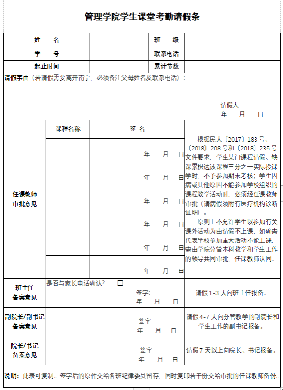 第三条 请假统一使用由学院指定的模板《管理学院学生课堂教学请假条》。